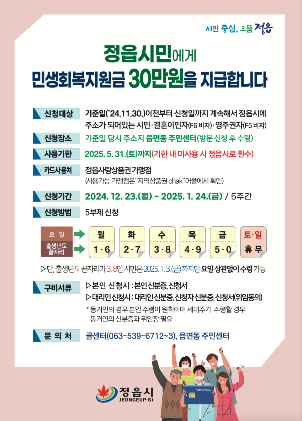 - 기준일(2024.11.30) 이전부터 신청일까지 계속해서 정읍시에 주소가 되어있는 시민, 결혼이민자, 영주권자